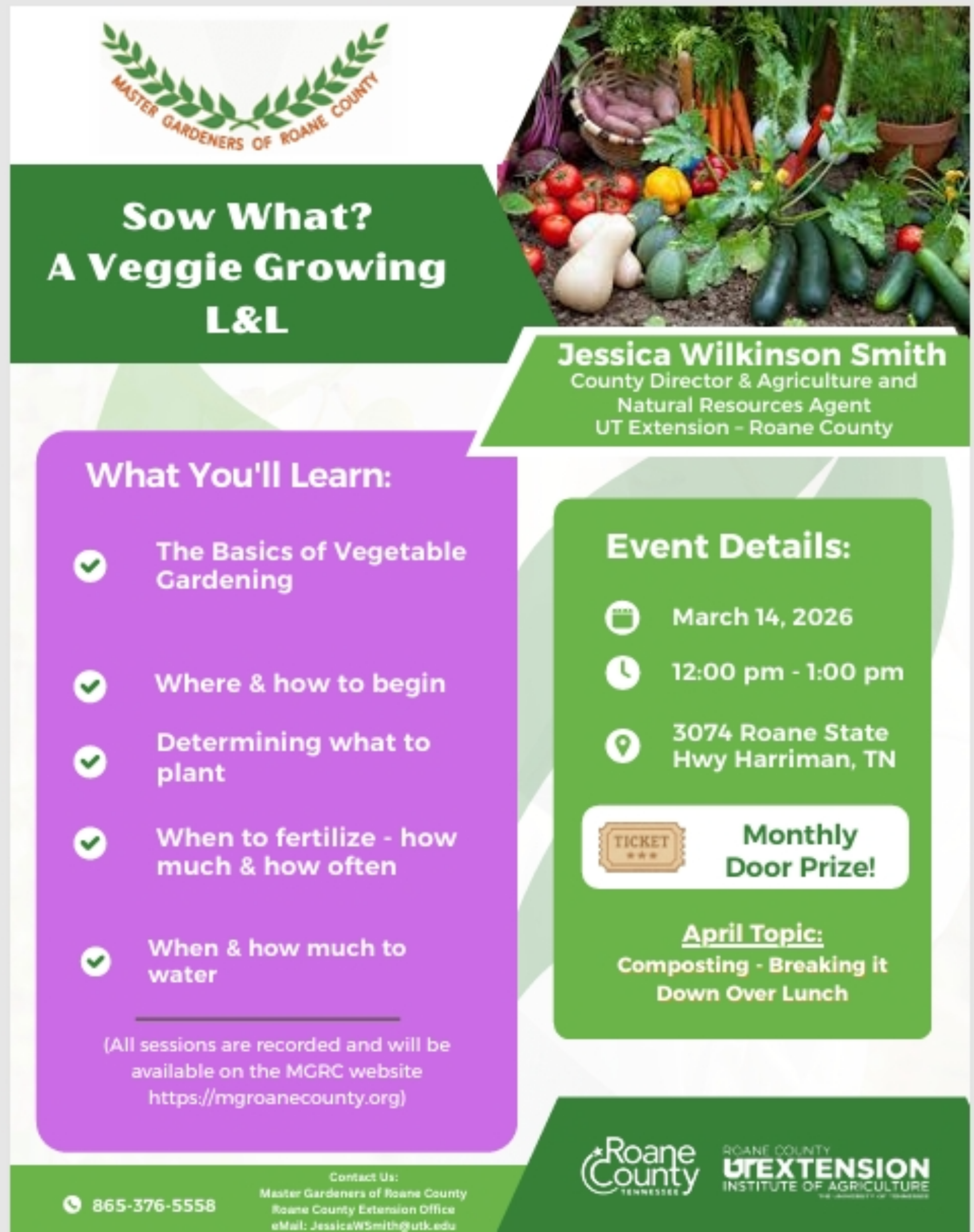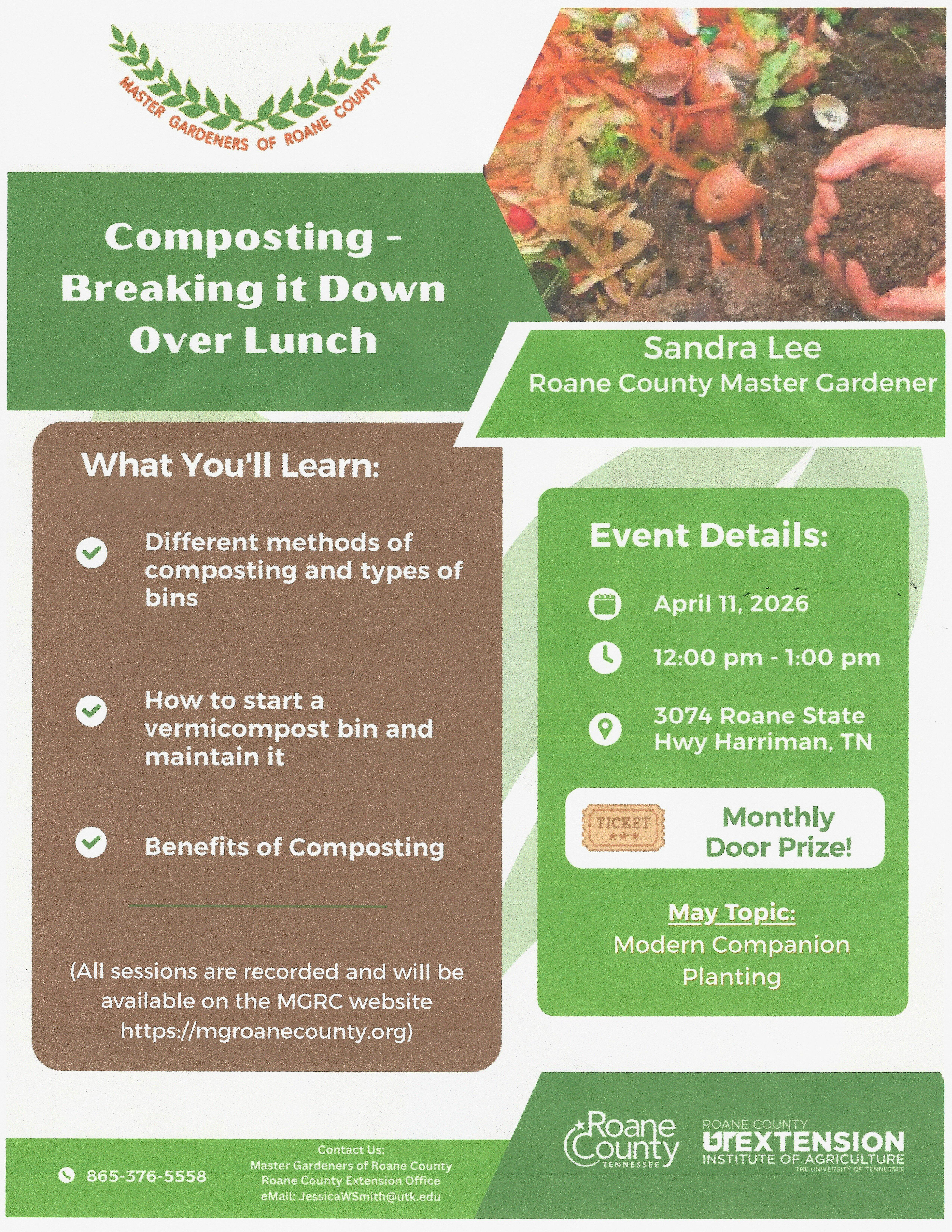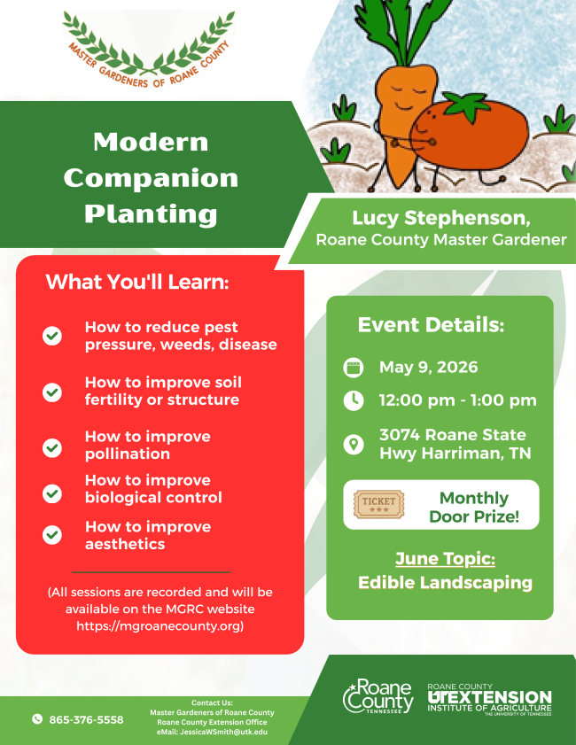 To receive updates and information on upcoming events hosted by the Master Gardeners of Roane County, subscribe at the link. https://lp.constantcontactpages.com/sl/WRUkQ9Z/mastergardeners